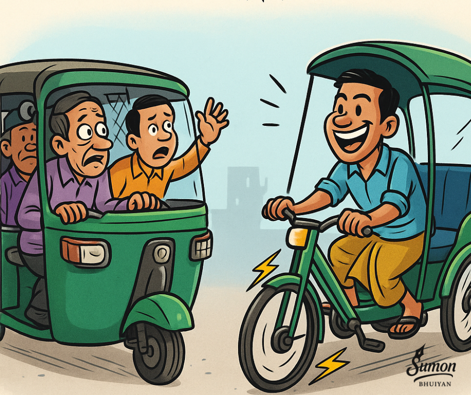 মাঝে মাঝে আমার ড্রাইভার ছুটিতে থাকলে, আমি সিএনজি তে করে অফিসে যাই। বেশ কিছু মাস যাবত গাড়ি চালানো ছেড়ে দিয়েছি। এখন ব্যাটারি রিকশায় (বর্তমান নাম—টেসলা) জ্বালায়। গাড়ি ড্রাইভ করা এখন বিরক্তির চরম পর্যায়ে পৌঁছে গেছে।